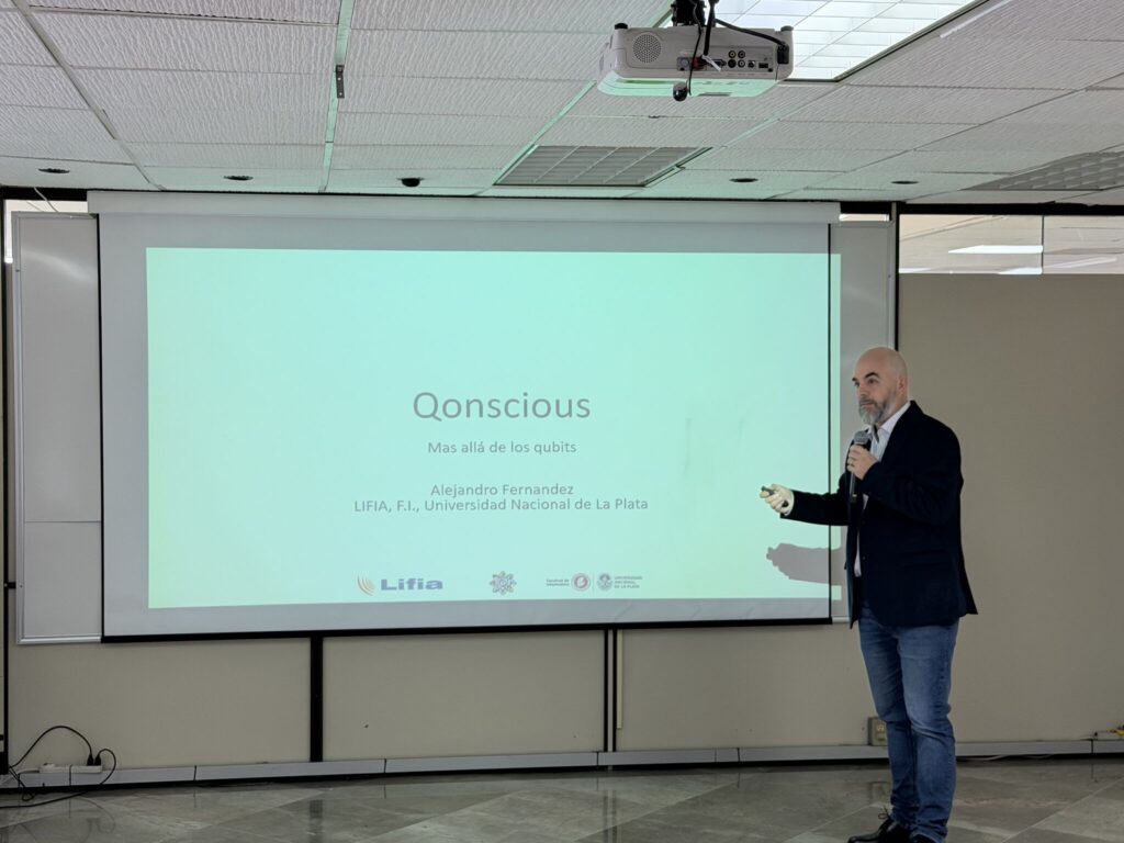 En su segunda presentación, el Dr. Fernández compartió los avances del proyecto Qonscious, una propuesta orientada a gestionar los recursos cuánticos en la era NISQ mediante herramientas de introspección y evaluación de “figuras de mérito”. Esta línea de trabajo se vincula con la búsqueda de enfoques resource-aware en programación cuántica, destacando la importancia de diseñar algoritmos adaptados a las capacidades reales del hardware cuántico.